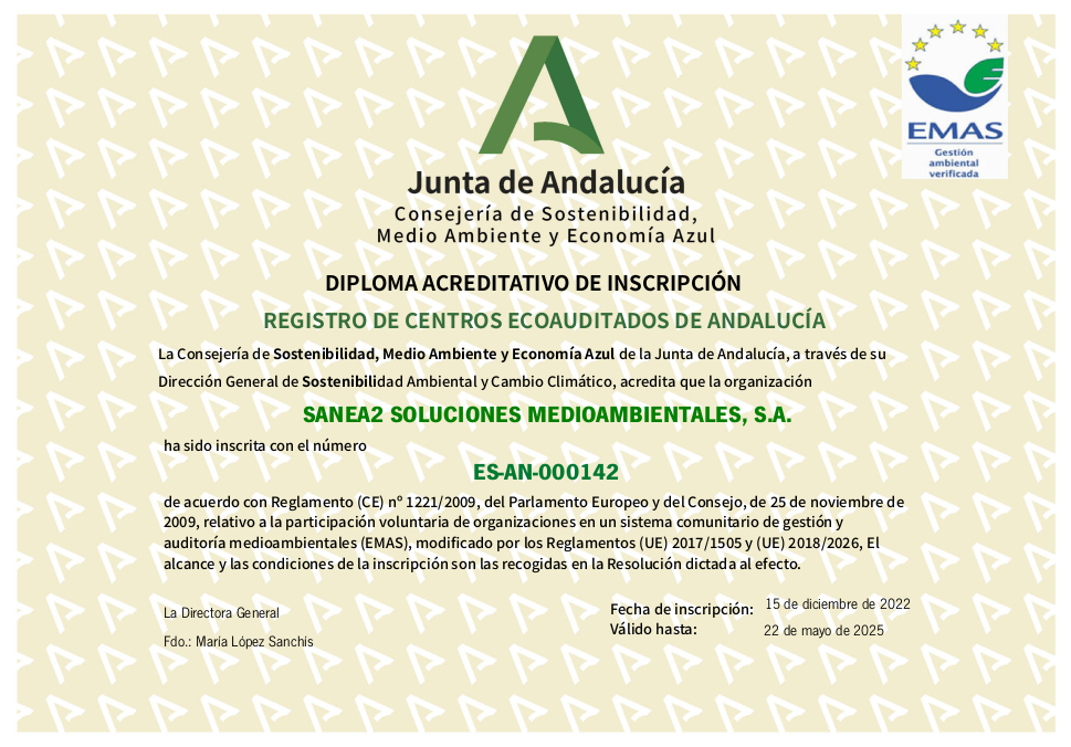 Contamos con el Certificado EMAS (Eco-Management and Audit Scheme), una distinción europea que reconoce el compromiso voluntario con la mejora continua del desempeño ambiental, reflejando la transparencia, responsabilidad y voluntad de Sanea2 por contribuir activamente a un entorno más sostenible.
